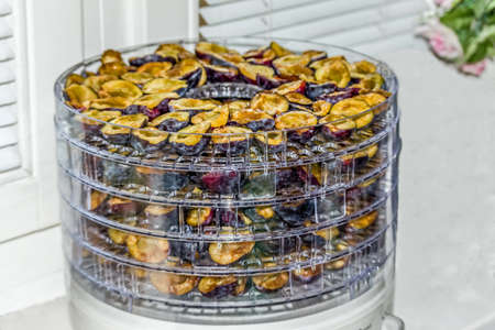 apple slices are in the tray of the electric dryer. Autumn preparations.