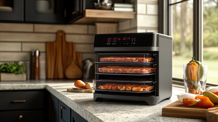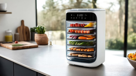 A sleek food dehydrator sits on a kitchen countertop, showcasing fresh vegetables and fruits. The modern design complements the inviting atmosphere, perfect for healthy meal prep.