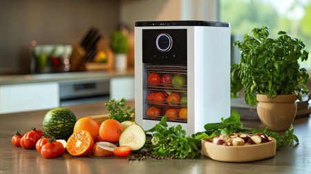 A modern food dehydrator sits atop a kitchen counter surrounded by fresh fruits and vegetables, showcasing vibrant colors. This image highlights healthy eating and fresh ingredient preparation, perfect for culinary inspiration.