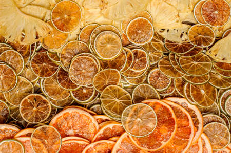 Top view of a large amount of neat, fresh and tasty slices of juicy pineapple, orange and lemon fruits arranged chaotically