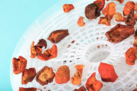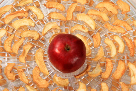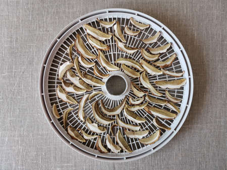 electric dryer for fruits and vegetables, close-up, apples are laid out on a white round grid