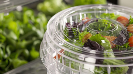 A detailed view of the clear plastic lid on an electric salad spinner providing visibility of the spinning process and keeping the contents contained