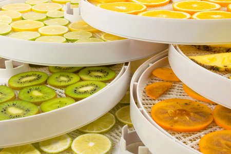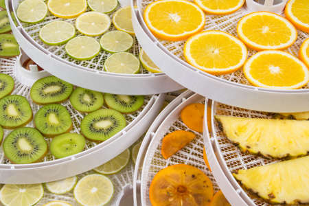 on the round white grates of the fruit and vegetable drying machine, there are fresh sliced kiwi, orange, pineapple, persimmon and lime, close-up