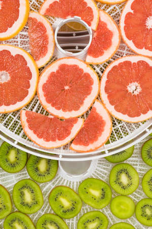 grapefruit and kiwi slices lie in drying trays, top view, close-up