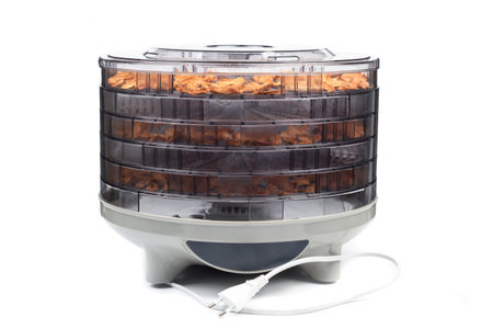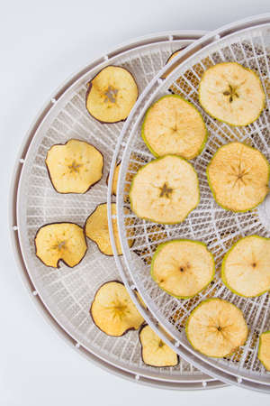 Electric dryer for vegetables and fruits with filled sections of dried apple slices. Close up, white background.