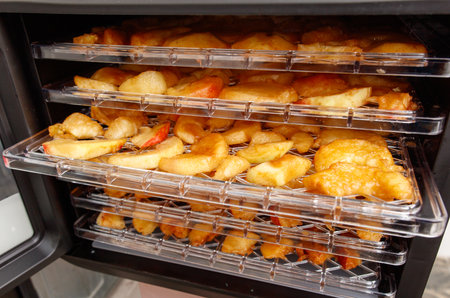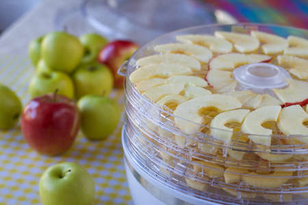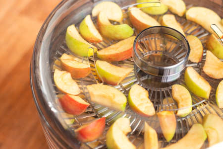 Sliced apples in the food dryer. Cut apples on dehydrator tray. Closeup, selective focus