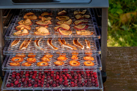 Dried fruits-apples, bananas, apricots and cherries on plastic pallets inside a home electric dehydrator