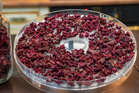 Dry red pitted cherries on a drying tray for dehydrator, close up. A way to preserve vitamins. Vegetarian meal, and healthy