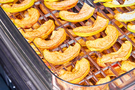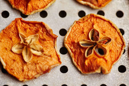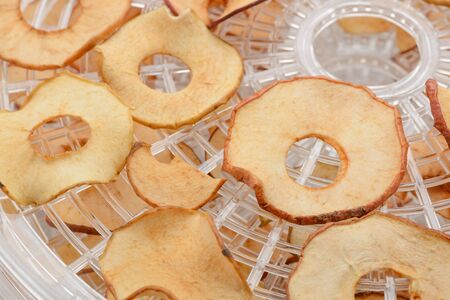 Close-up on dried apple slices. Cut fruits spread on a reck of a dryer. Source of vitamins and nutrients.