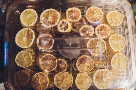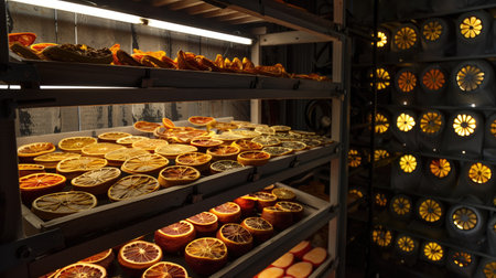 Chamber for drying dried fruits.Trays with dried citrus fruits in dark rustic interior with copy space