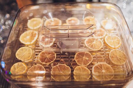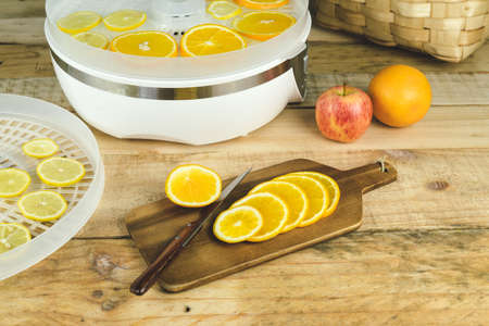 Orange slices in a dehydrator on a wooden table. Kitchen equipment for drying fruits and vegetables with several racks.
