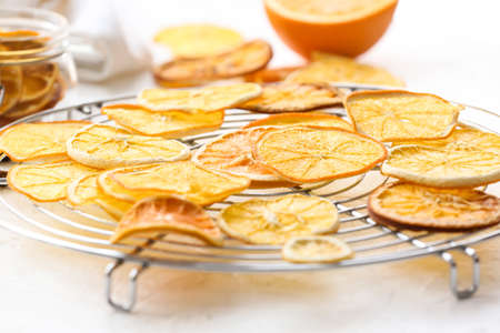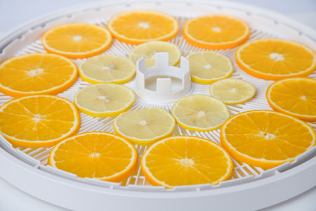 Close up of orange and lemon slices in a white plastic tray for drying.