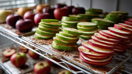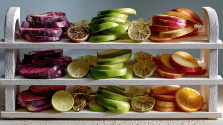 A visually appealing setup featuring freshly sliced apples in various colors arranged neatly on a rack, showcasing healthy snack options in natural light.