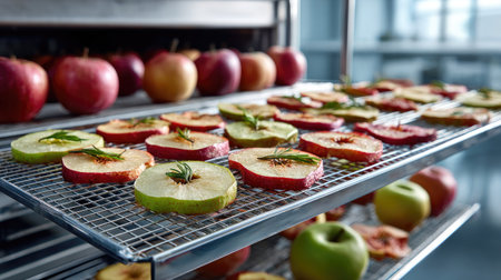 A collection of freshly sliced apples drying on a metallic rack, showcasing vibrant colors. Whole apples are visible in the background, emphasizing healthy food preparation.