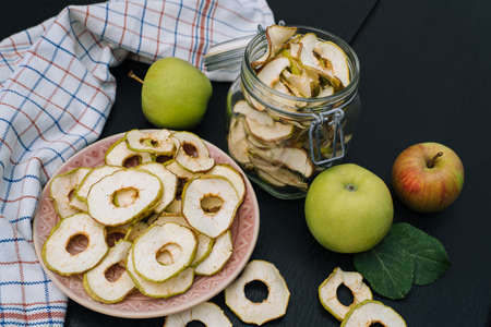 Dried apple slices in open glass jar. Homemade organic dried apple chips with fresh apple on black table background. Sweet vegan snack. Healthy and nutrition concept. Shallow depth of field