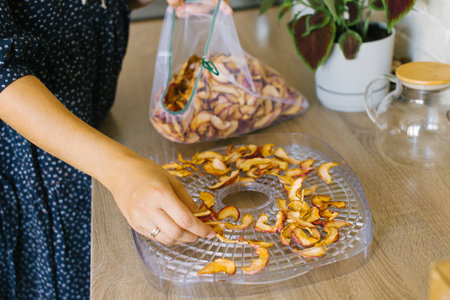 Hands of mature female in apron taking dried slices of persimmon or other fruit from top tray of domestic food dryer in the kitchen