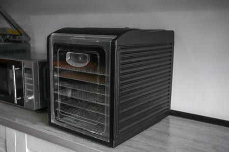 Electric Food Dehydrator on the wooden table. 3D rendering