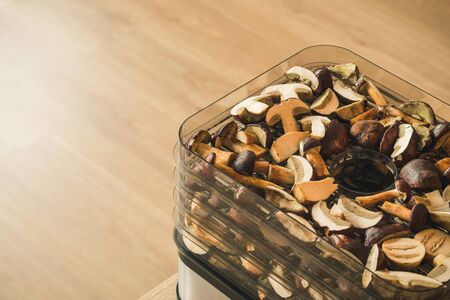 Vegetables dryer on wooden table with wooden background. Preparing for drying mushrooms.