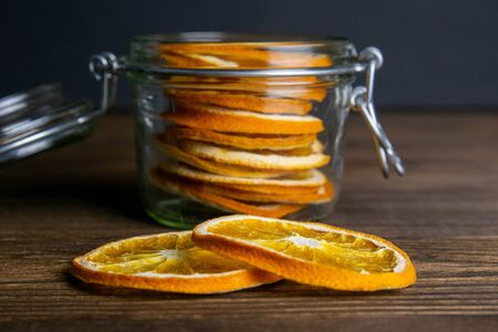 Dried oranges in a jar and on a dark wooden table next to the jar. Close-up.