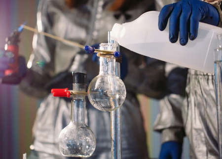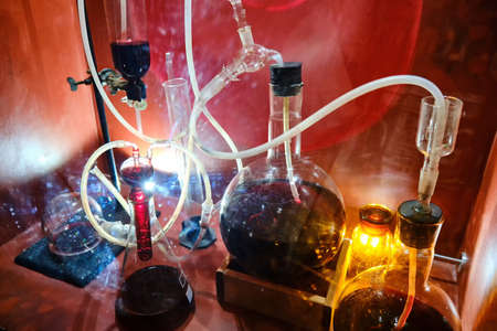 Glass flasks with poisonous water. Production of hazardous liquids for the environment.