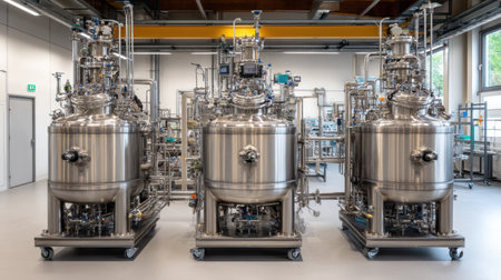 Three stainless steel industrial mixers stand ready in a modern chemical production facility, featuring intricate piping and advanced technology for efficient processing.