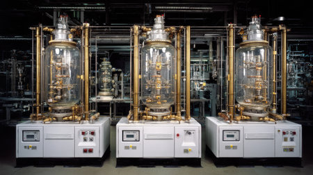 This image showcases three high-tech glass reactors in a modern laboratory setting, representing advanced industrial processes and cutting-edge scientific research.
