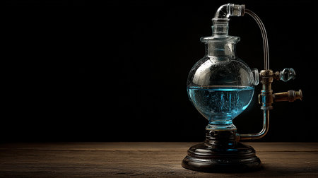 A clear glass flask sits on a stand, filled with water, surrounded by scientific instruments and bottles, illuminated by warm, soft lighting in a lab.