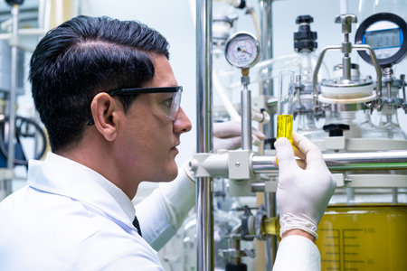 Chemical analyzes in production. Fuel analysis at a chemical plant. Laboratory tests in industry. Fuel quality check. Quality control of raw materials.