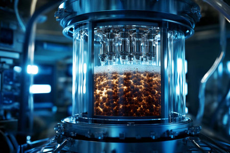 Close up view of a glowing orange cylindrical object inside a transparent glass tube within an industrial setting. The background is blurred but shows metallic structures and control panels. The lighting is dramatic with warm and cool tones.
