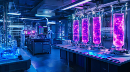Exploring futuristic technology in a laboratory with glowing bioreactor at night. Generative AI