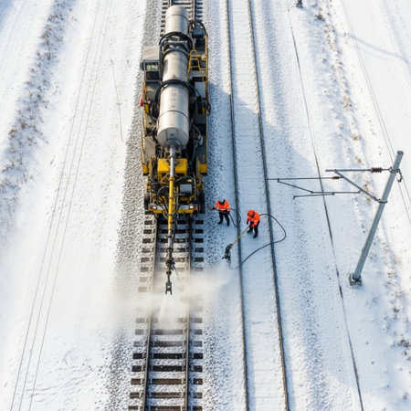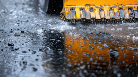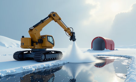 yellow excavator on tracks operating in a vast, icy polar landscape, spraying a powerful jet of water/foam over the edge of a frozen pool or water body