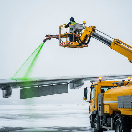 BUCHAREST, ROMANIA - February 16, 2017: Editorial image of a man defrosting an airplane wing before departure in Bucharest, Romania.