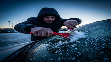 A low angle, cinematic photograph of a man focused on scraping thick ice from his vehicle's windshie