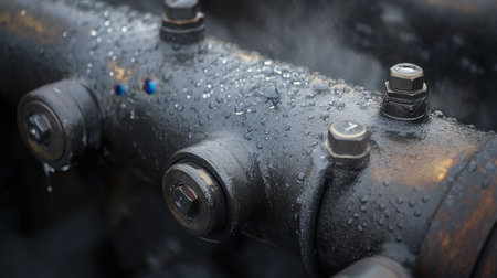 This image captures a close-up view of an industrial pipe showcasing droplets of moisture and steam on a shiny, black surface, highlighting engineering details.