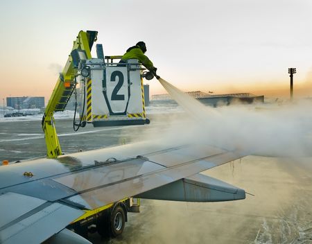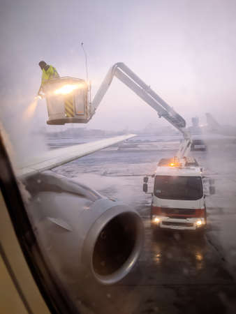 de-icing of aircraft wing in Sheremetyevo airport in winter evening
