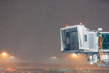 Winter frosty night at airport during heavy snowfall. Illiminated empty passenger boarding bridge against dark sky with snowflakes.