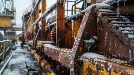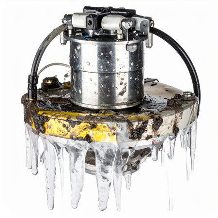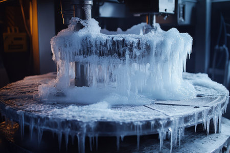 A layer of ice covers spinning machinery in a dark industrial area, showing the effects of extreme cold.