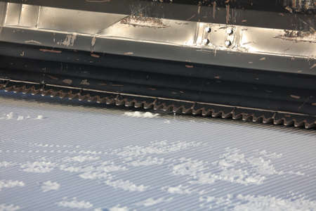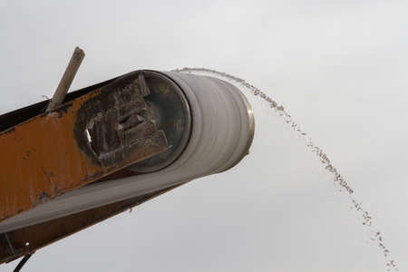Salt production, conveyor belt with marine salt produced by the evaporation of seawater.