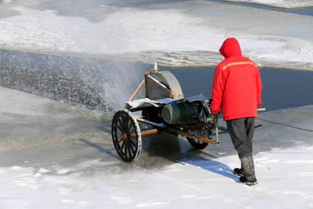 An ice sawyer in an orange life jacket carves ice panels on the ice of a frozen pond