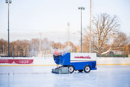Moscow, Russia - November 29, 2020: Ice Resurfacer in action at the VDNKH park ice rink. Ice polishing process at the rink