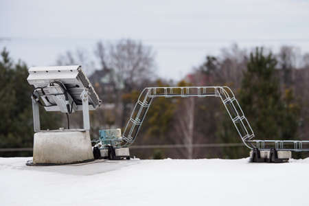 Snow gun or snow cannon in winter ski resort. Turned off snowmaking machine in snowy winter time