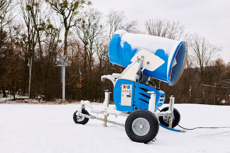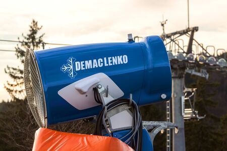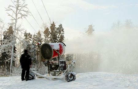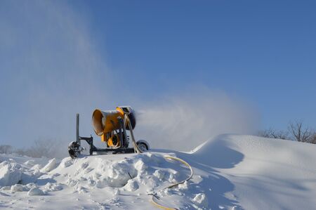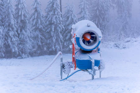 Snow making machine, named snow cannon or snow gun making snow for snowboarding, skiing in mountains.