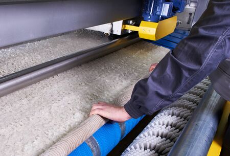 Laundry worker in the process of working on automatic machine for carpet washing in dry cleaning