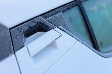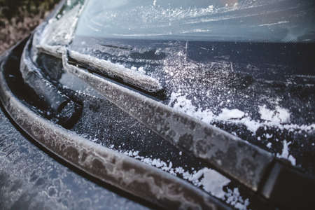 Frozen windscreen and windshield wipers totally covered with ice, caution, poor view causes dangerous driving im winter, traffic background with copy space, selective focus