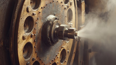 This close-up image captures an industrial machine part releasing steam, showcasing the intricate details of vintage mechanics and technology.
