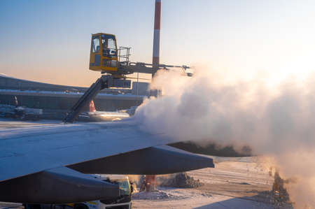 Moscow, Russia - January 12, 2022: Sheremetyevo International Airport. De-icing an aircraft wing. Process of spraying anti-icing white fluid the rear part of the wing of a plane at the airport at sunrise in winter
