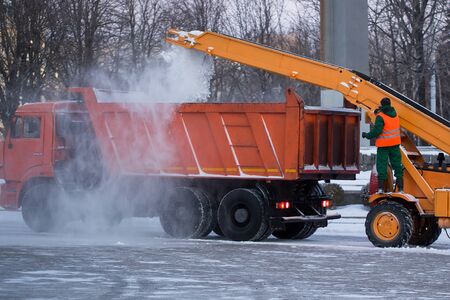 Winter. Municipal urban road maintenance. Snow removal on the streets. Close-up of falling snowballs from a snowplow and into a truck body. Abundance of snow.