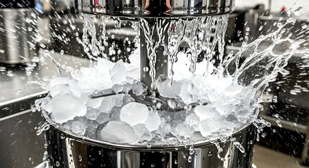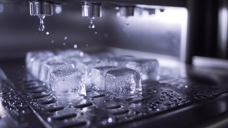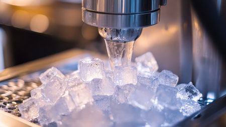Clean, sharp-edged ice cubes being dispensed into a cup by an automatic ice machine in a high-end restaurant.