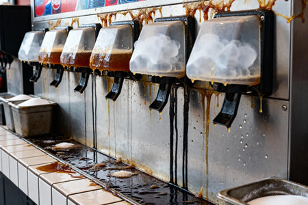 A close-up of a soda fountain with ice and syrup dripping down the front, showing the details of the machine