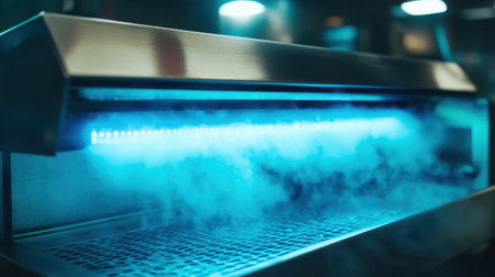 A stunning view of an industrial machine emitting vibrant blue steam in a modern kitchen setting, showcasing innovative design and high-tech culinary equipment.